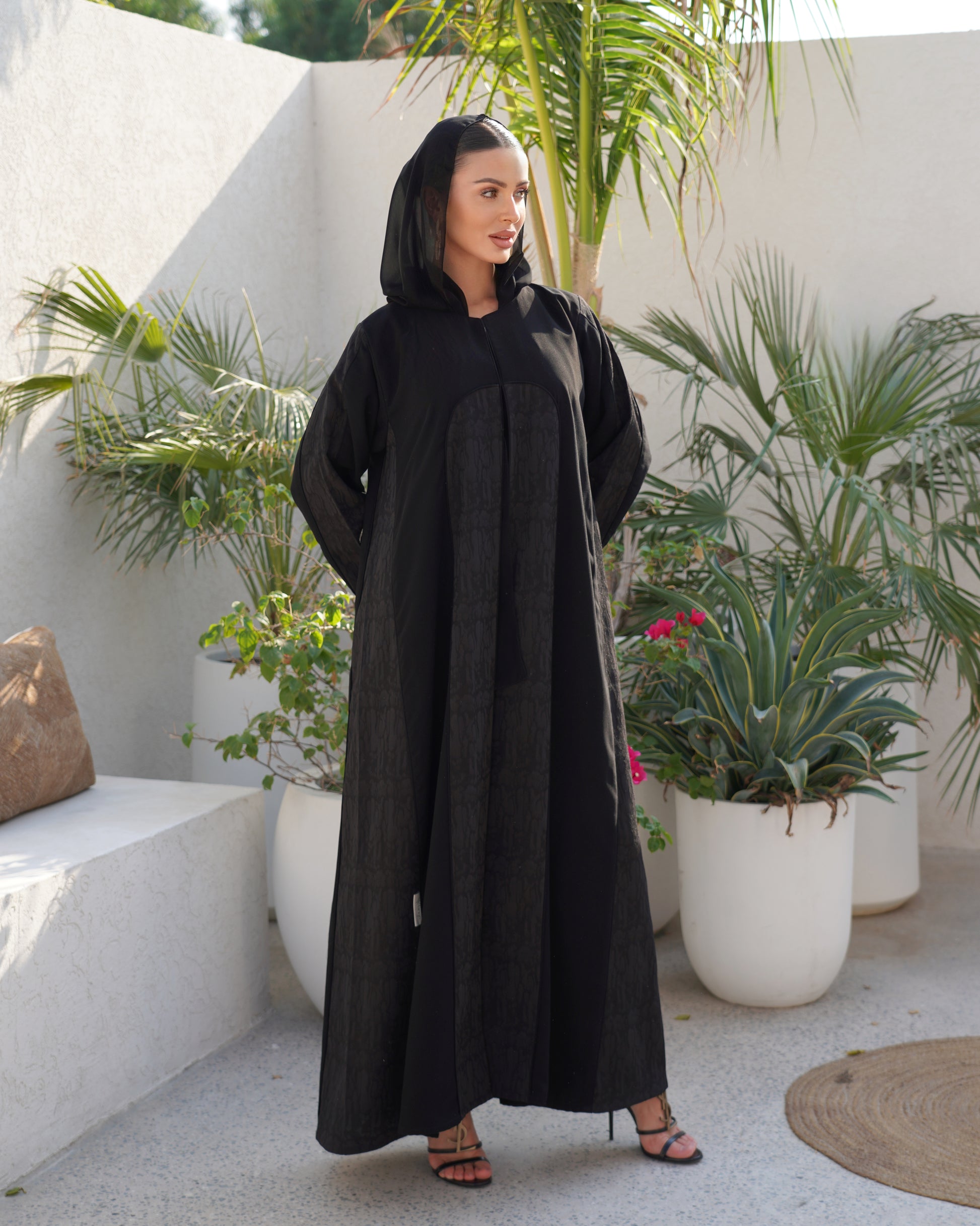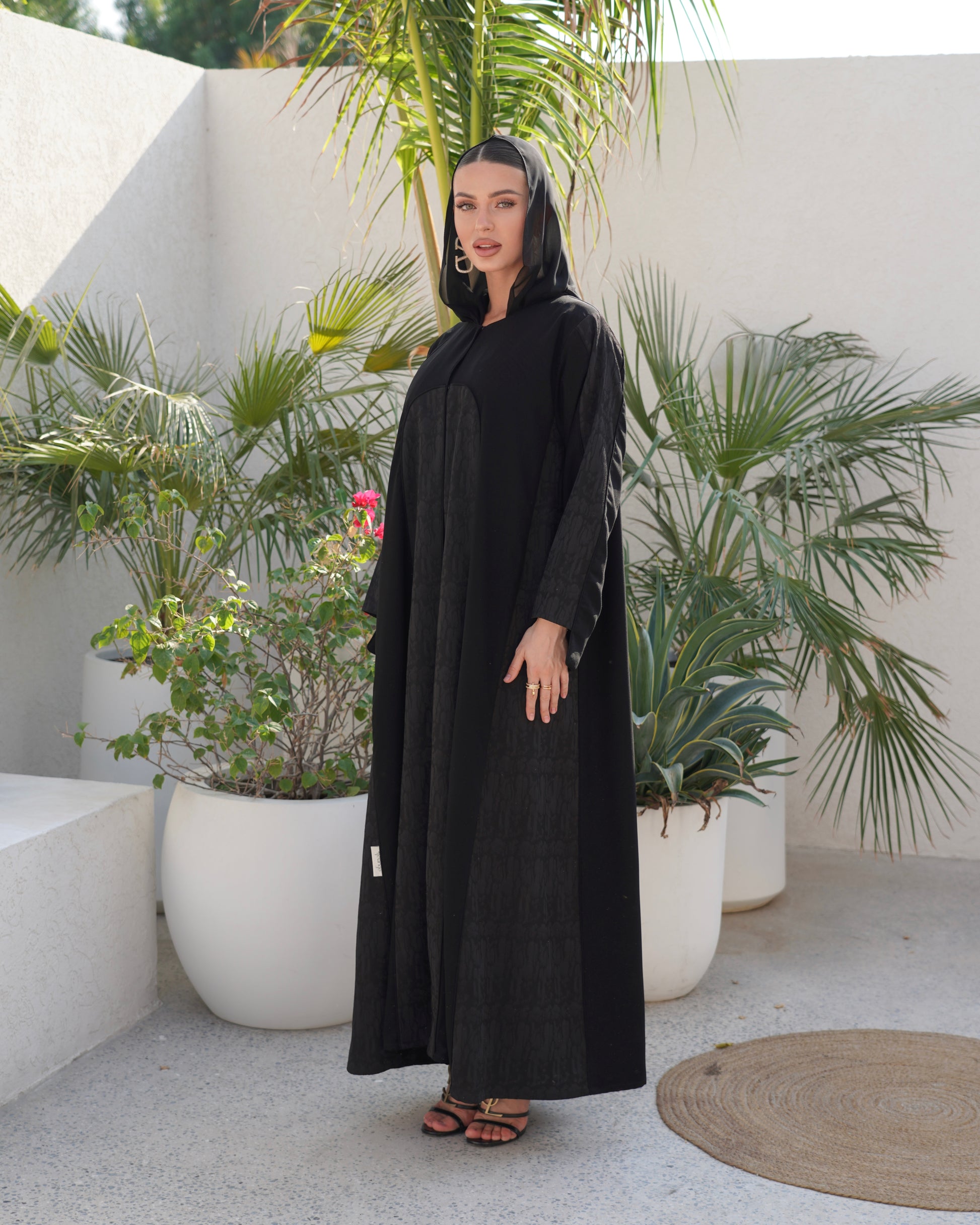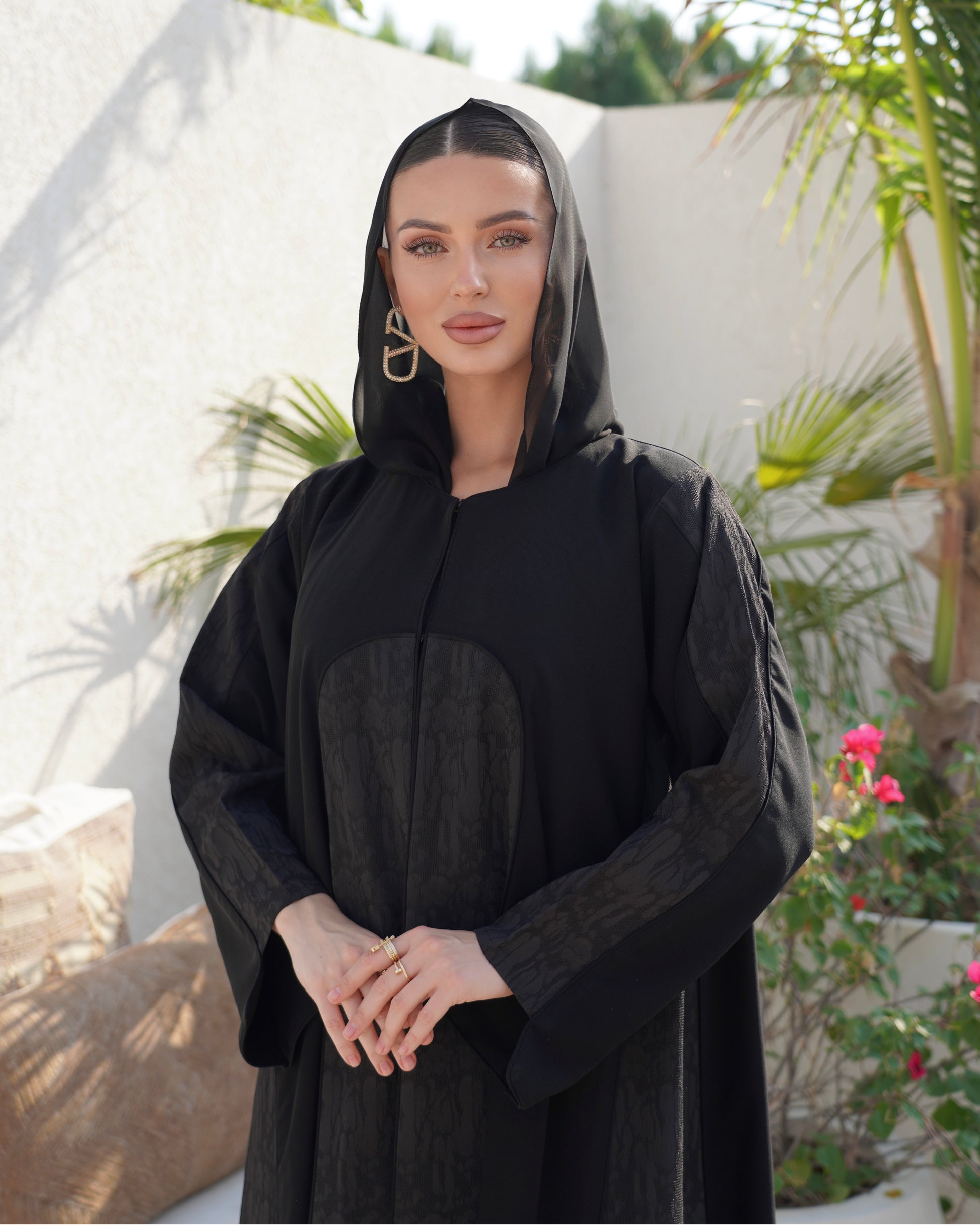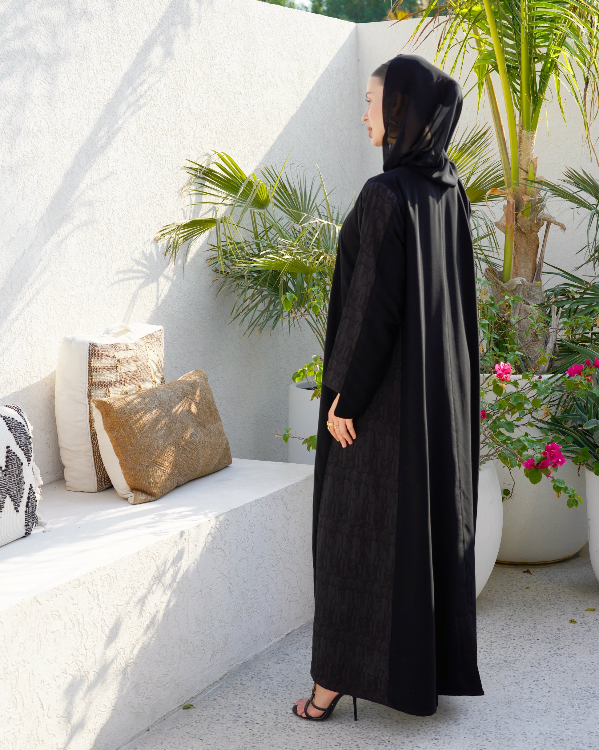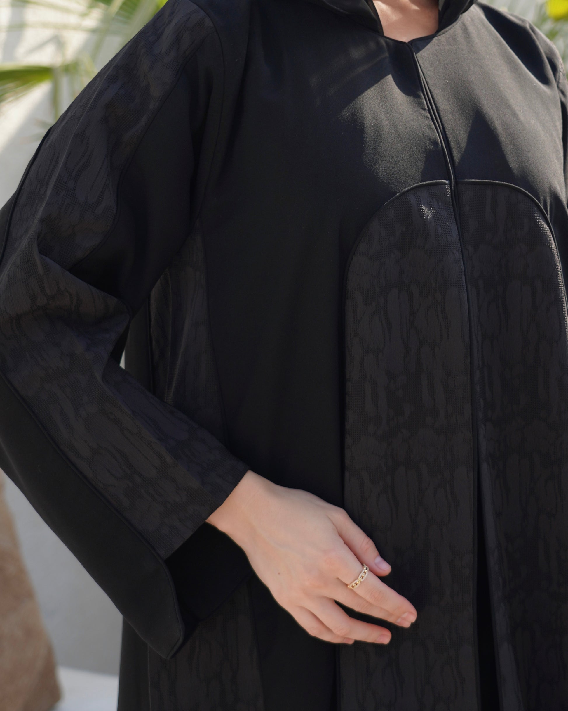 Black crepe abaya with textured crepe panels on the front and sleeves. The design features a curved front detail that adds depth and contrast to the look paired with a matching sheila to complete the look with effortless elegance.