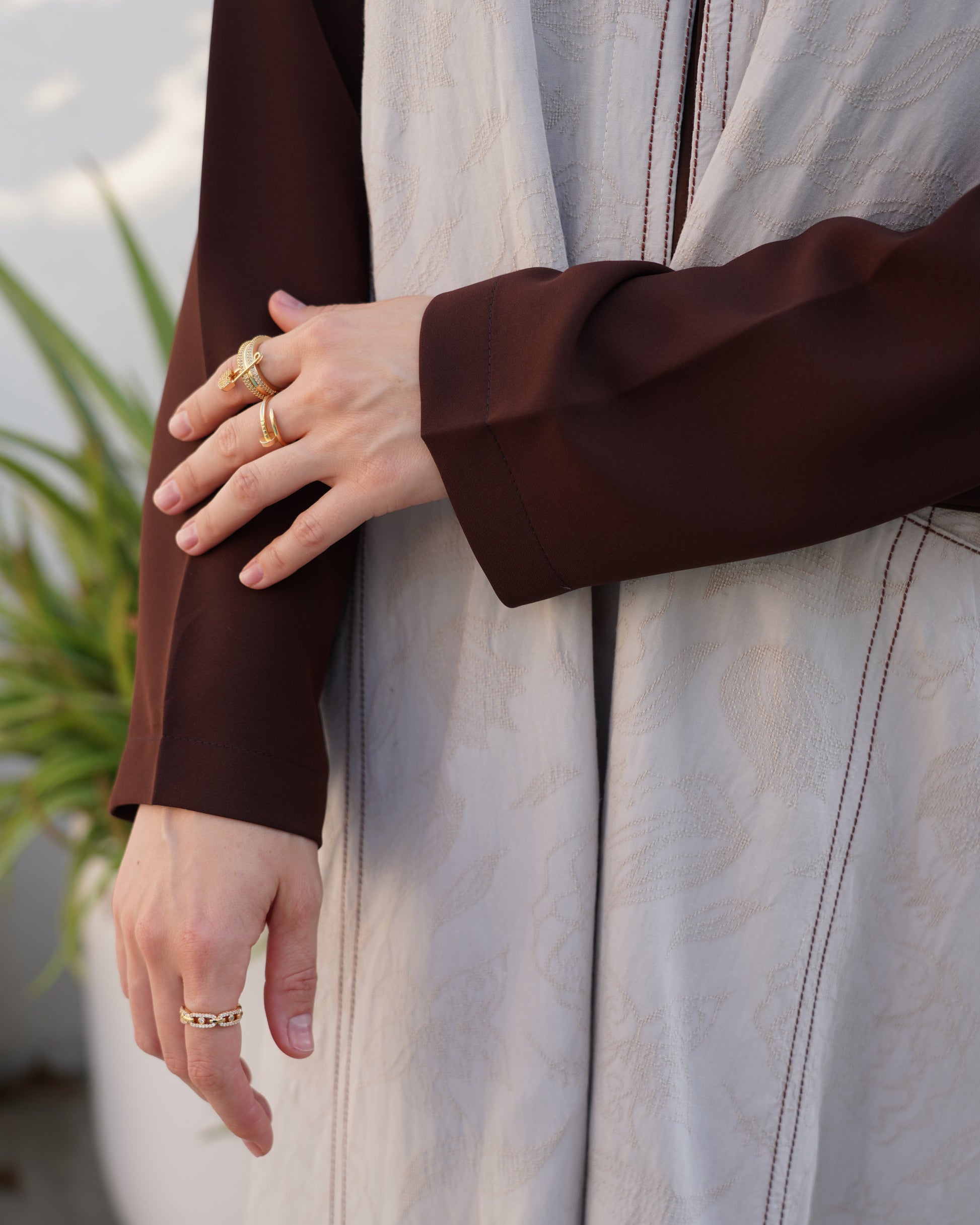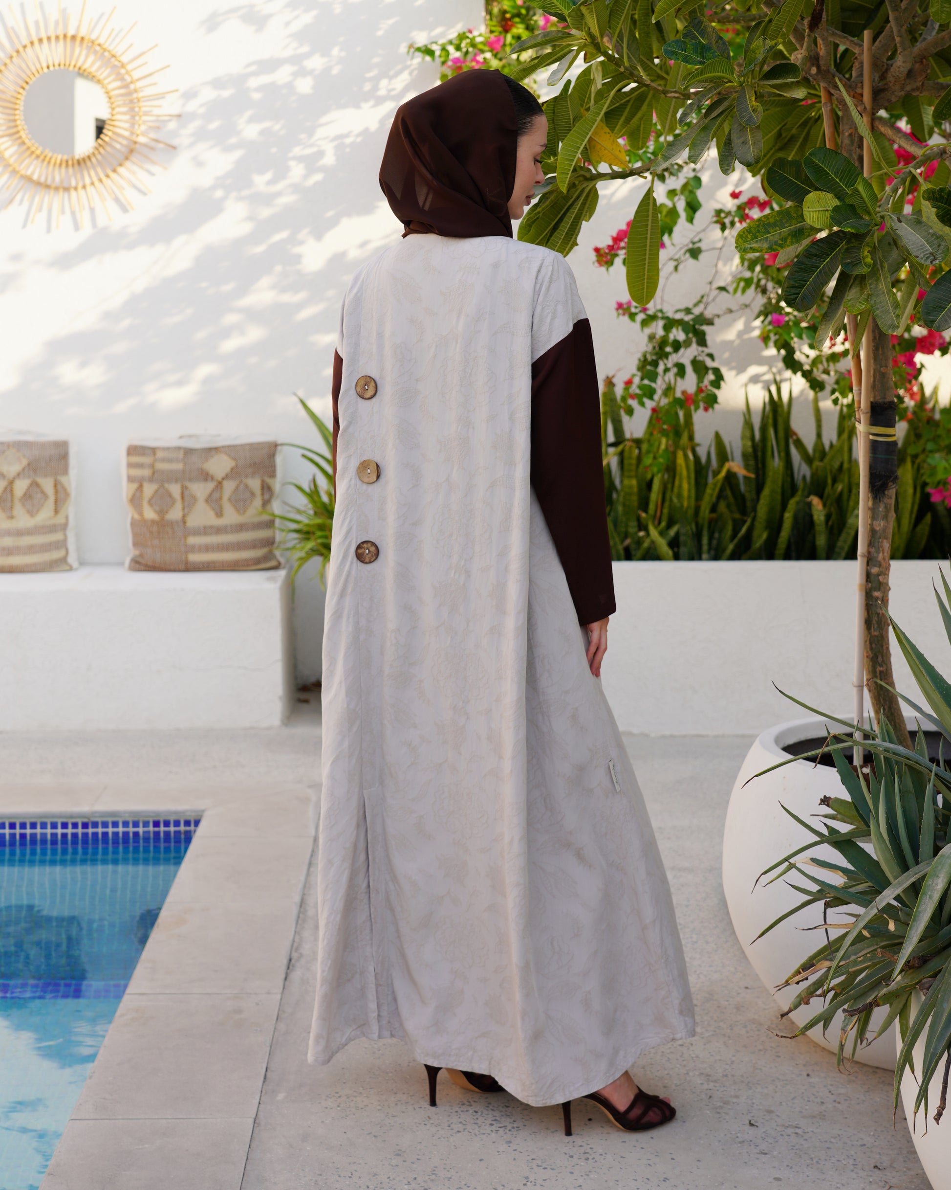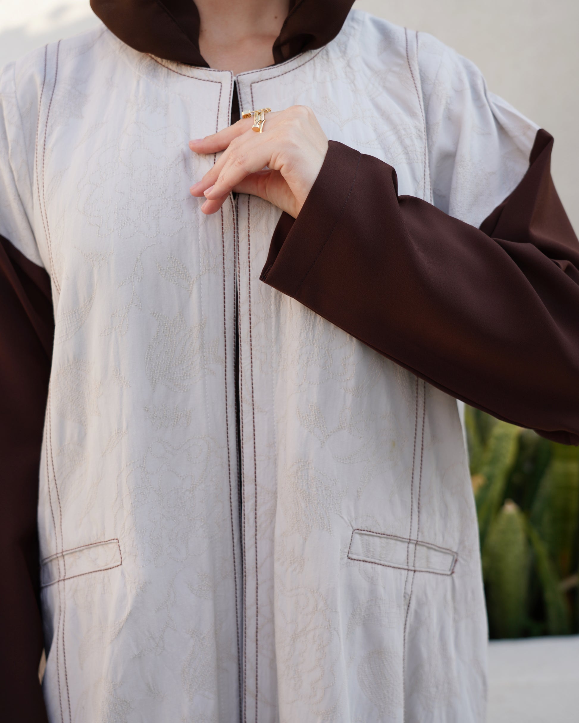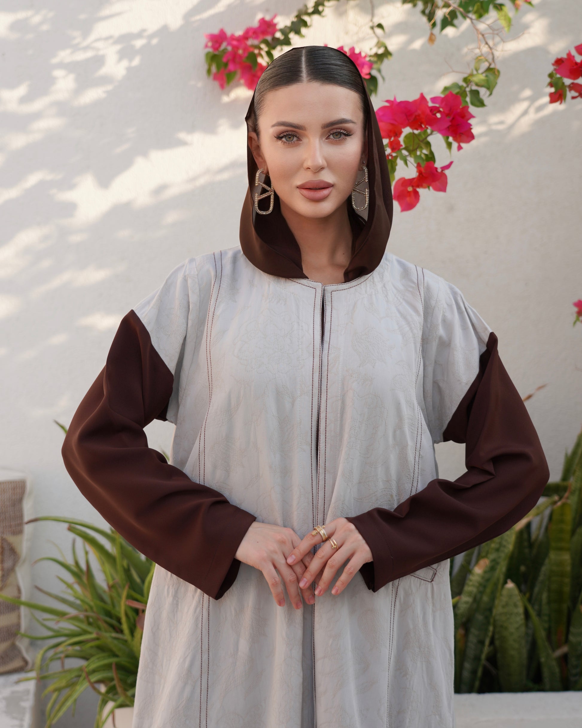 Light gray linen abaya with slightly dropped brown sleeves in a smooth structured finish.The front includes detailed stitching that creates the look of pockets for a refined finish.